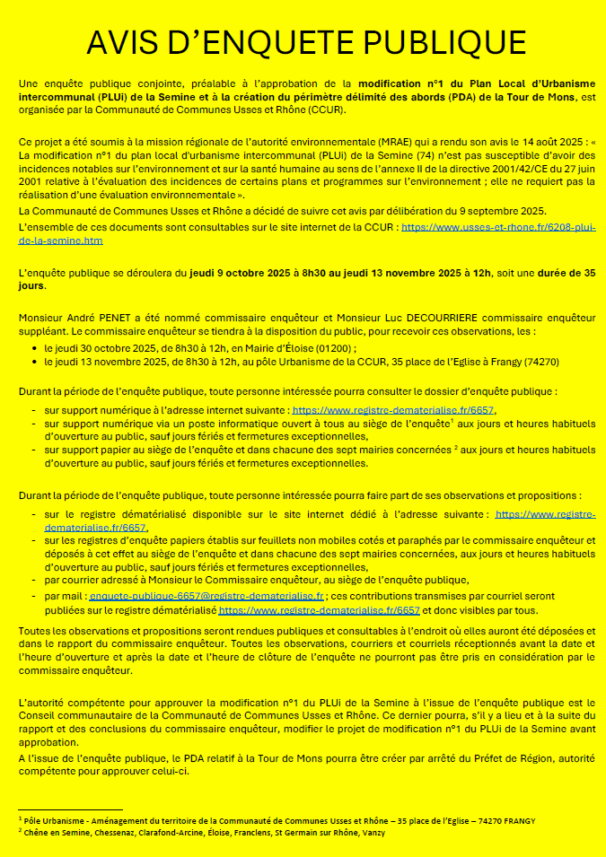 Une enquête publique conjointe, préalable à l’approbation de la modification n°1 du Plan Local d’Urbanisme intercommunal (PLUi) de la Semine et à la création du périmètre délimité des abords (PDA) de la Tour de Mons, est organisée par la Communauté de Communes Usses et Rhône (CCUR).